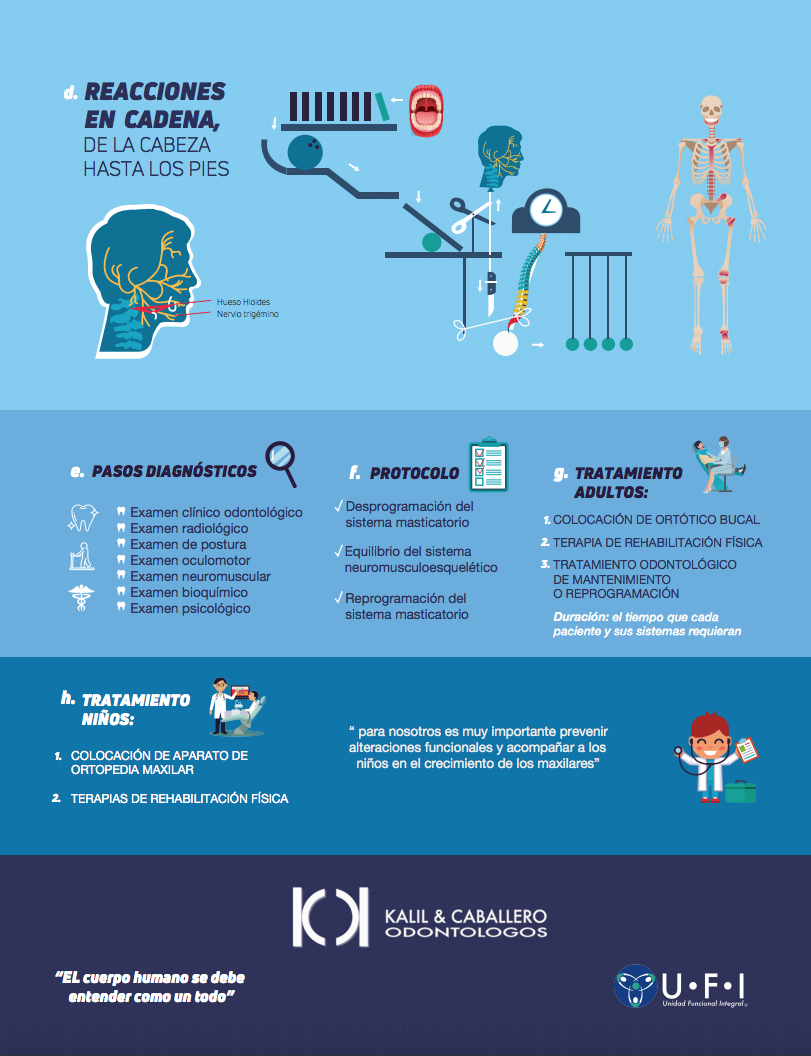 El diagnostico odontológico permite iniciar el tratamiento correcto de las alteraciones masticatorias que tienen efecto sobre la postura. Luego se remite a nuestros fisioterapeutas para el tratamiento complementario del sistema musculo esquelético del paciente, y la elaboración de un dispositivo intrabucal especial (splint) que permite el pronto alivio de los síntomas.